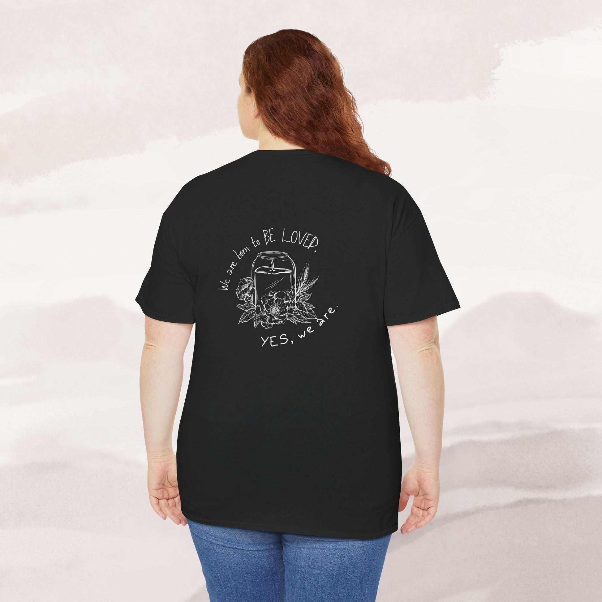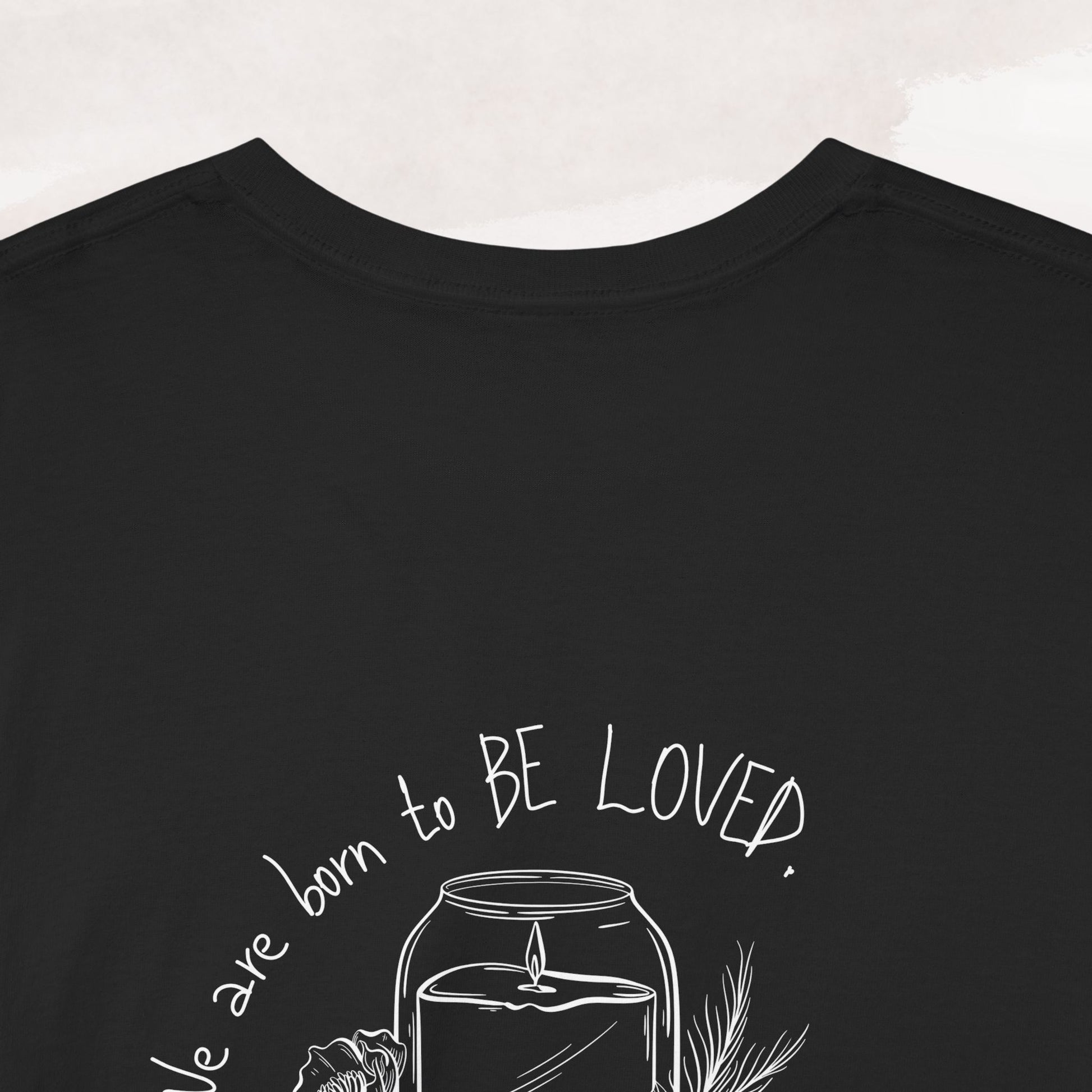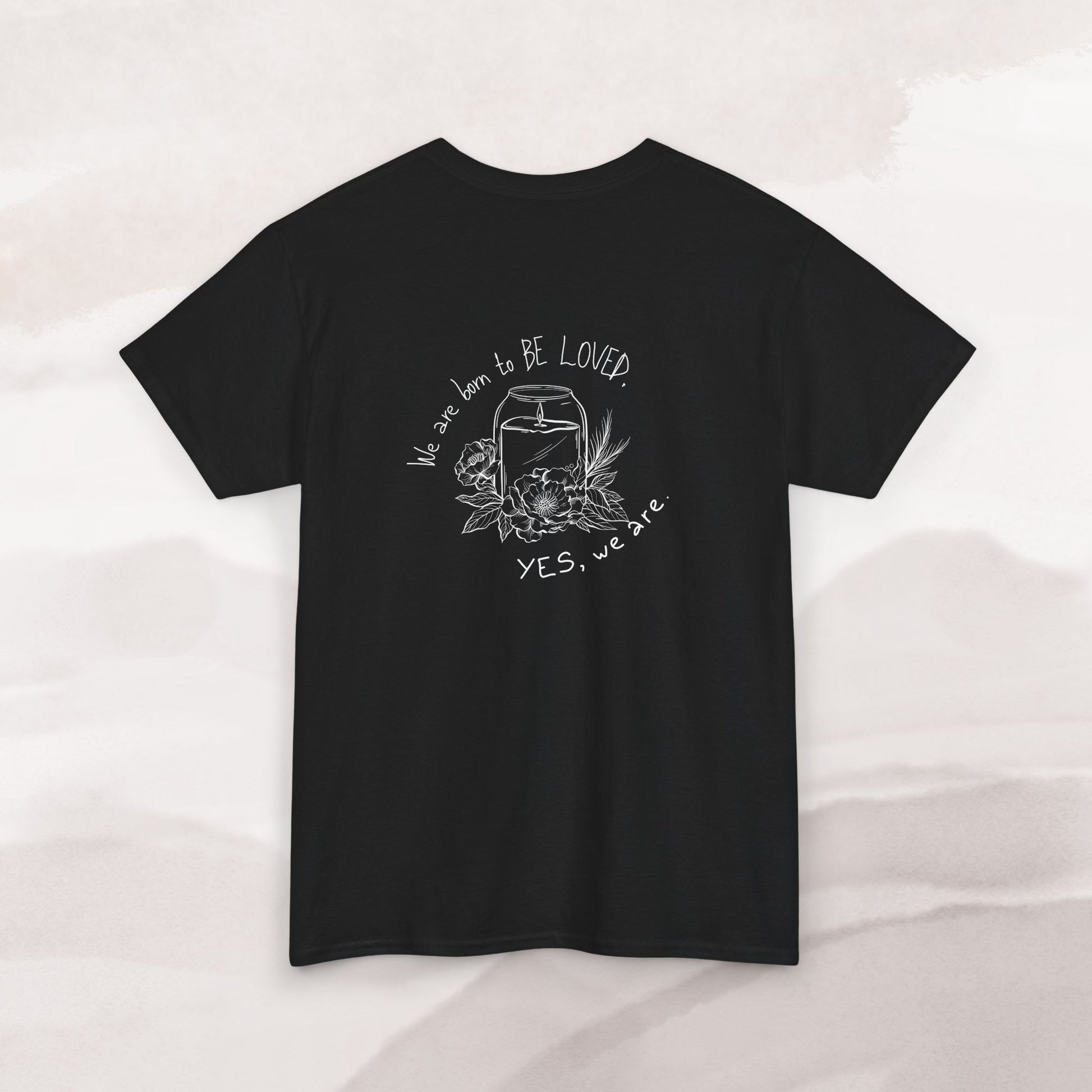 "We Are Born To Be Loved. Yes We Are." is featured boldly on the back, serving as a daily reminder and conversation starter.