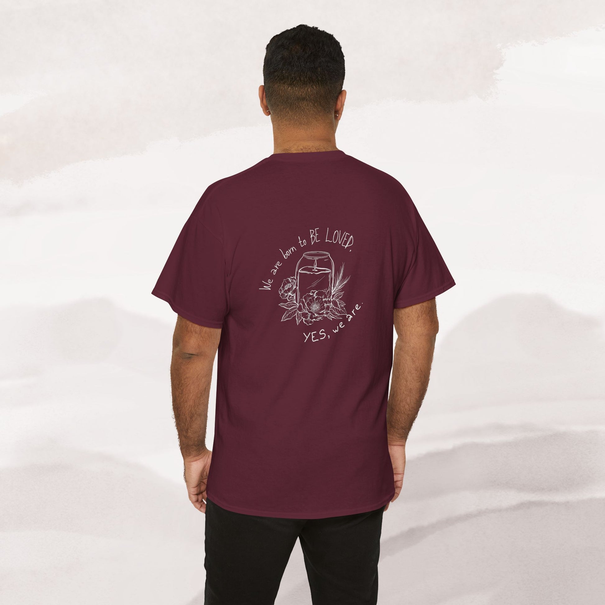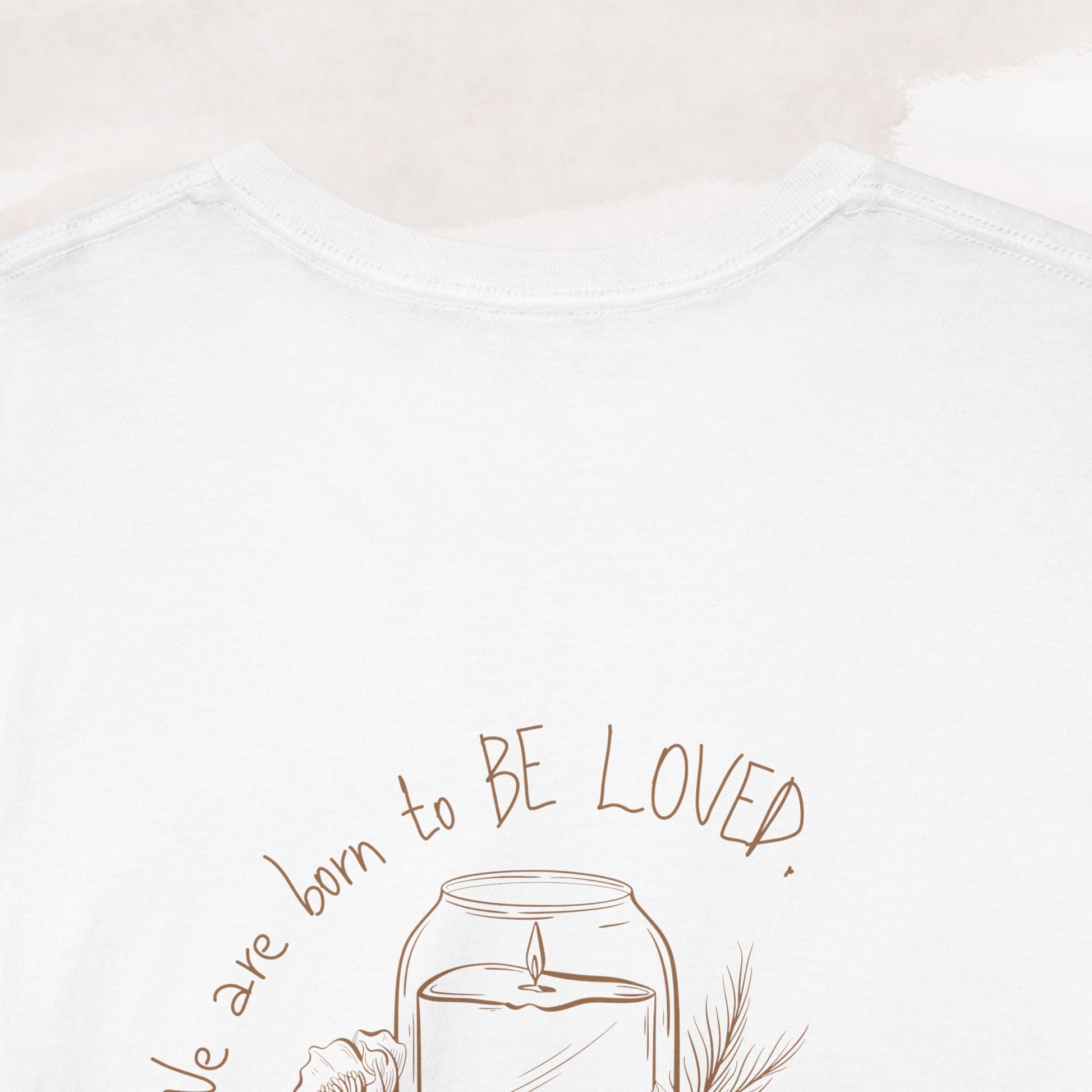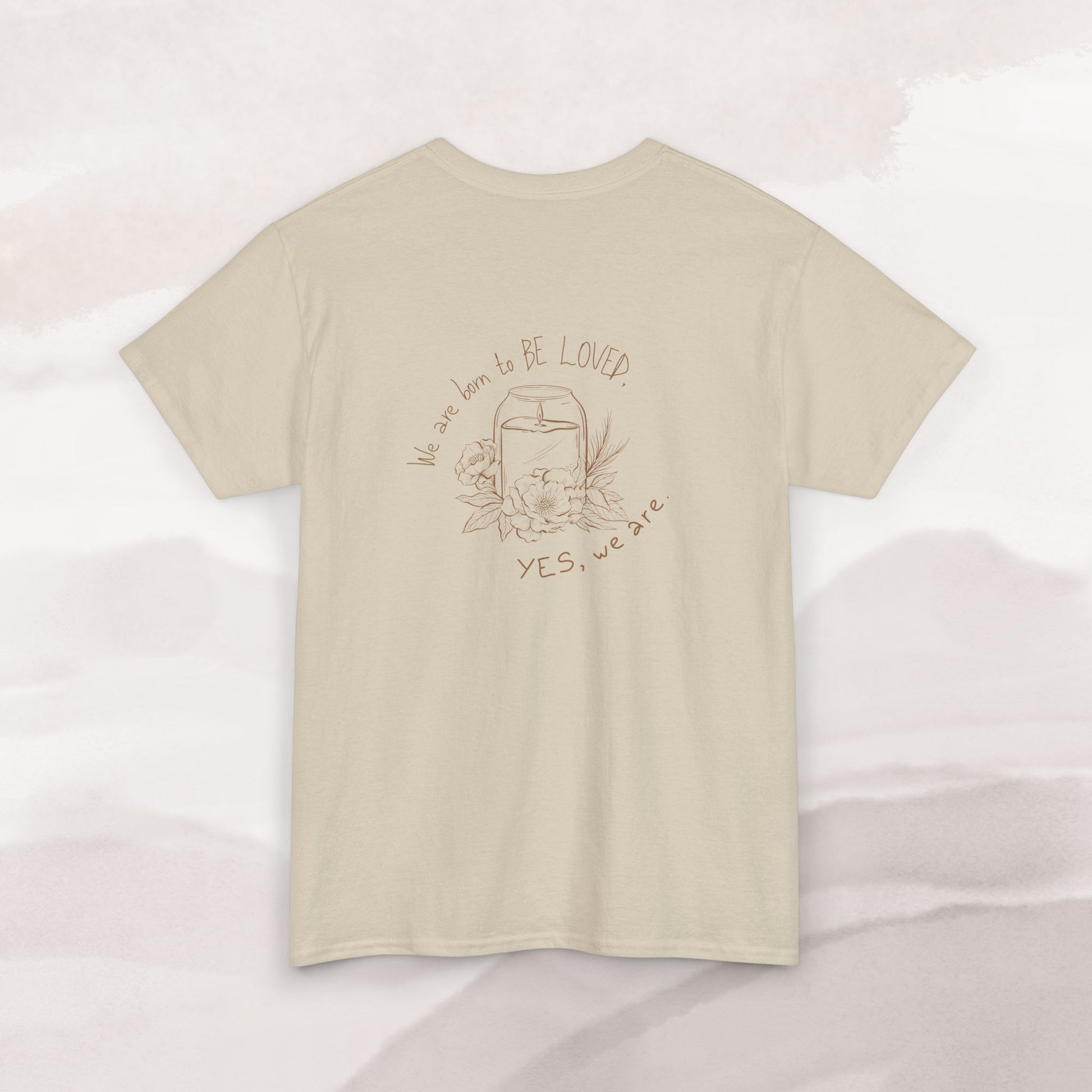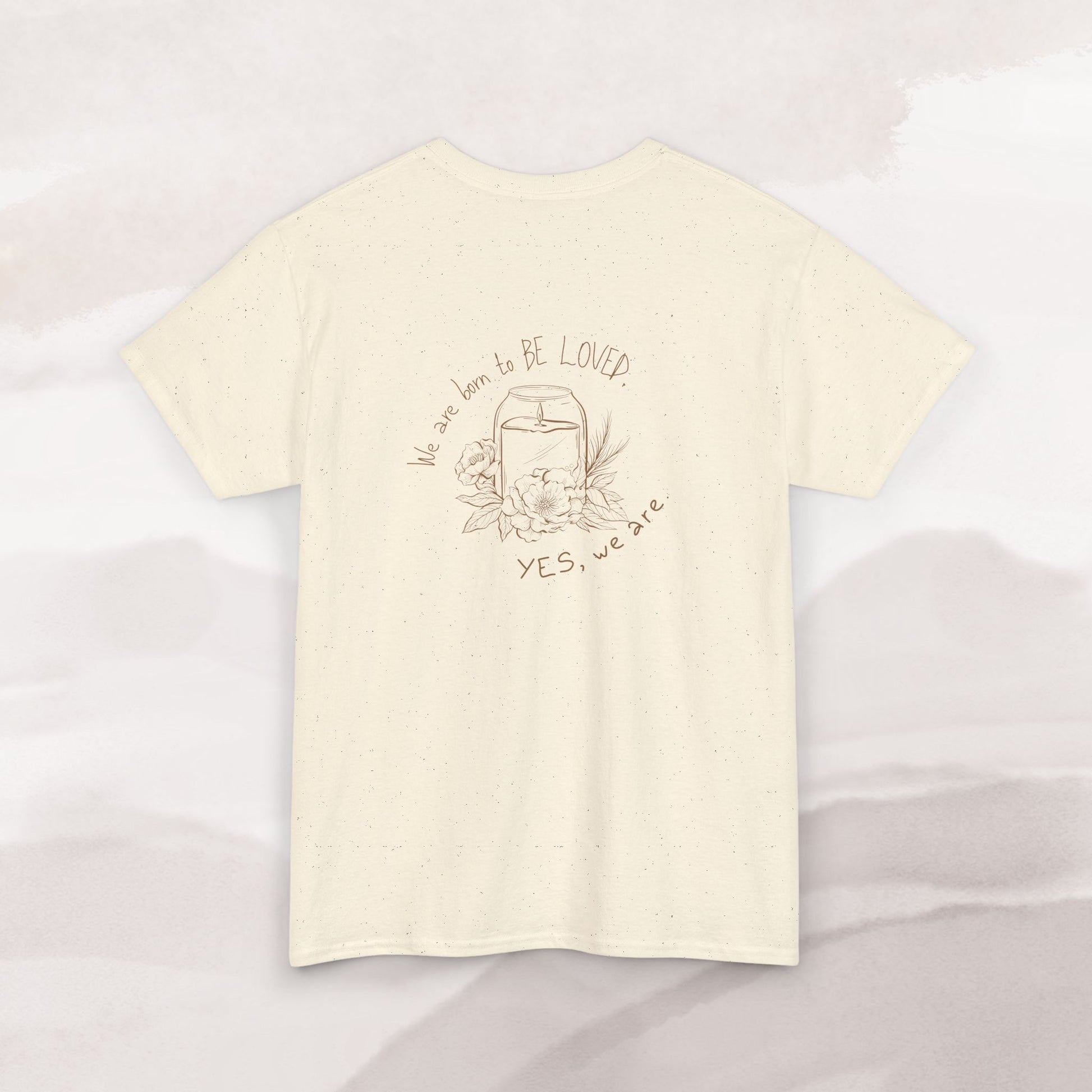 "We Are Born To Be Loved. Yes We Are." is featured boldly on the back, serving as a daily reminder and conversation starter.